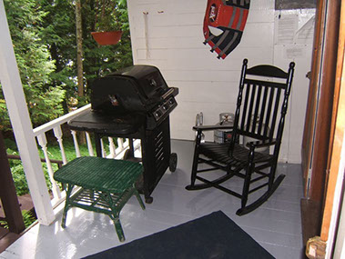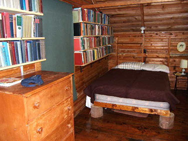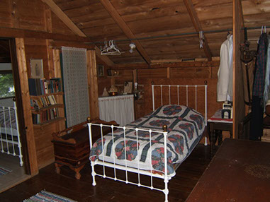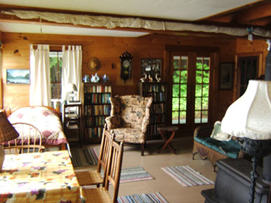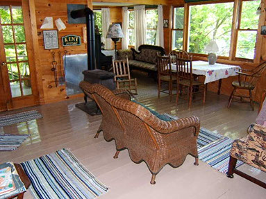 Second floor: two full-sized beds overlook the lake; single bed in middle room; one full-sized bed behind cottage looking up into the woods. Single bed downstairs in front room. The front room and dining area look out over the lake. One can monitor children swimming at the waterfront.